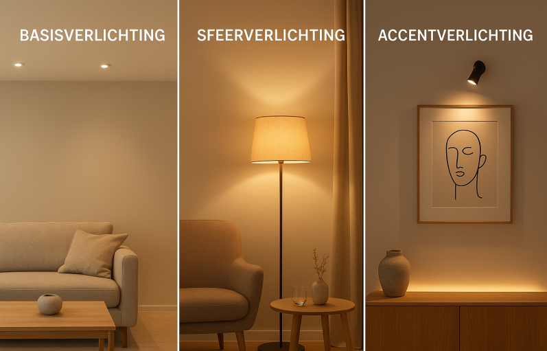 Het geheim van een goed lichtplan zit niet in één lamp, maar in de combinatie van deze drie soorten verlichting. Basisverlichting maakt een ruimte functioneel, sfeerverlichting maakt het gezellig en accentverlichting geeft karakter en diepte.